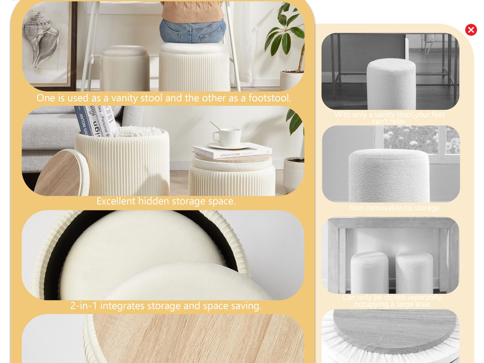 【Perfect Set Design】This round storage ottoman comes in a set of two, with the larger size measuring 14.76" x 14.76" x 17.32" and the smaller size 12.6" x 12.6" x 14.17". These two round storage ottomans can be neatly stacked together, offering a convenient space-saving solution. 【Ample Storage Space】Both the large and small ottomans offer generous storage capacity. You can place them in the entryway to store shoes, in the living room for blankets and throw pillows, in the children's room to organize toys, or in the dressing room for cosmetics, bags, and other essentials. 【Versatile Ottoman】This ottoman can serve as a footrest or shoe bench in the living room, or even as a vanity stool in the dressing room. The two reversible tops add the functionality of side tables, allowing you to place items such as coffee, books, and more on top. 【Comfortable and Durable】The ottoman's surface is made with thick, high-resilience foam, ensuring it retains its shape even after long-term use. The velvet fabric adds an extra layer of comfort to the touch. The frame is crafted from high-quality wood, enhancing the durability and extending the product's lifespan. 【Perfect After-Sales Service】No assembly is required for this ottoman upon arrival. Should you have any questions or concerns after receiving your product, please contact our customer service immediately. We will respond within 24 hours and work to resolve any issues promptly.