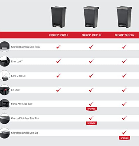 STAINLESS-STEEL ACCENTS: Charcoal stainless-steel rim and pedal upgrade the aesthetics of the container to complement your space PREMIUM, MODERN DESIGN: Designed with clean, modern lines and a flared base to elevate the aesthetic of the container while increasing stability SLOW CLOSE LID: Quiet, controlled lid closure is designed to reduce unwanted noise and ease down gently LID LOCK: Discrete lid lock keeps the container lid locked open for longer tasks, or closed to keep out pets and children METAL RIM HIDES BAG: Integrated LinerLock(TM) technology hides liner bags from view to maintain a sleek look and secures the bag to the container to prevent slipping