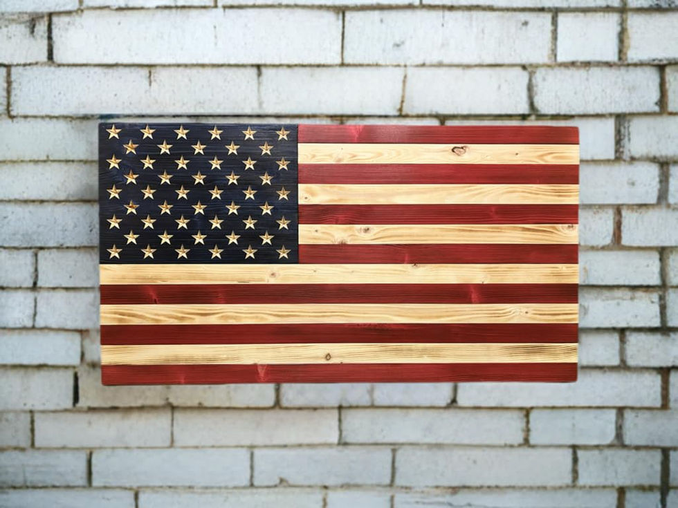 Handcrafted: This American flag wall art is meticulously hand-painted on wood for a unique, artisanal touch. Versatile Decor: Available in Natural or Weather Protected finish. 5 available sizes: 13x25, 19.5x36, 26x47, 30.5x57.5, and 34x65 Durable Construction: Crafted from high-quality wood, ensuring long-lasting durability and resistance to wear and tear. Eye-Catching Design: The vibrant colors and intricate details of the hand-painted American flag create a striking visual statement. Easy Installation: Designed for hassle-free wall mounting, allowing you to proudly display your patriotism.