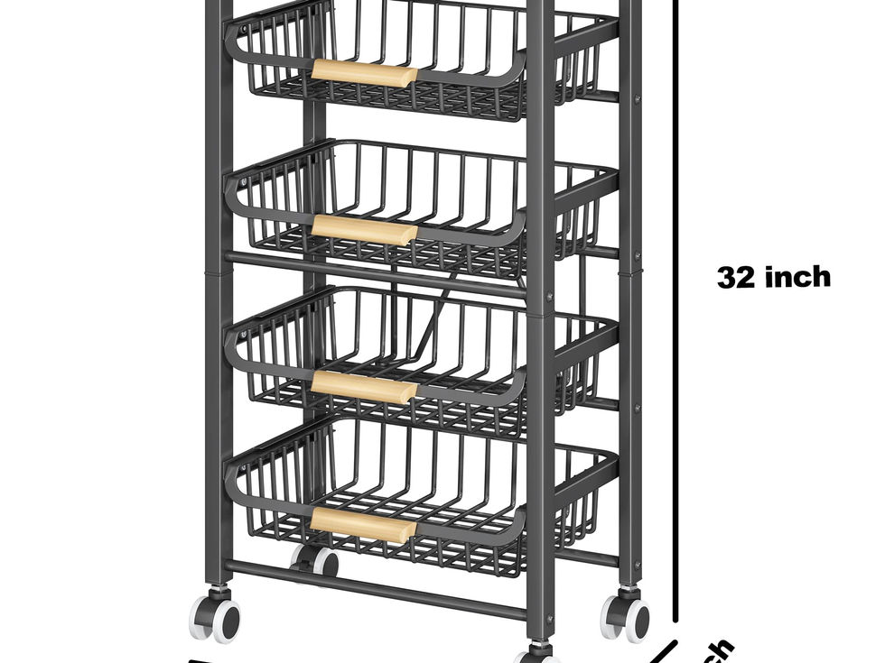 【Wood Top】: A wood top can put kitchen supplies on the top,such as pot, pans, spice jars and etc. 【Pull-out Baskets】The wire fruit vegetable basket for kitchen has wood handle and rail which can storage or pull out the basket, easily take fruit and vegetable out. 【Multifunctional Usage】Available as a veggie basket, fruit stand, book rack, kids toy bins, potato and onion storage rack, towel holder, apartment essentials, baskets for gifts, suitable for the kitchen organization, home decor, bathroom, office, bedroom, laundry room, craft room, pantry, etc 【Easy to Move】: New design with 4 quality casters(2 lockable). Flexible wheels, help you move this rolling storage basket to everywhere you wanted 【Sturdy】Fruit basket made of high-quality rustproof metal and plastic. The rustproof surface is with black coated finish. For sturdy and durability, not easy to deform.