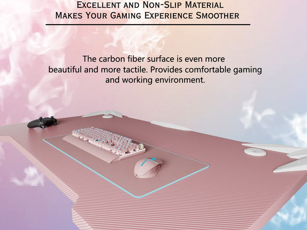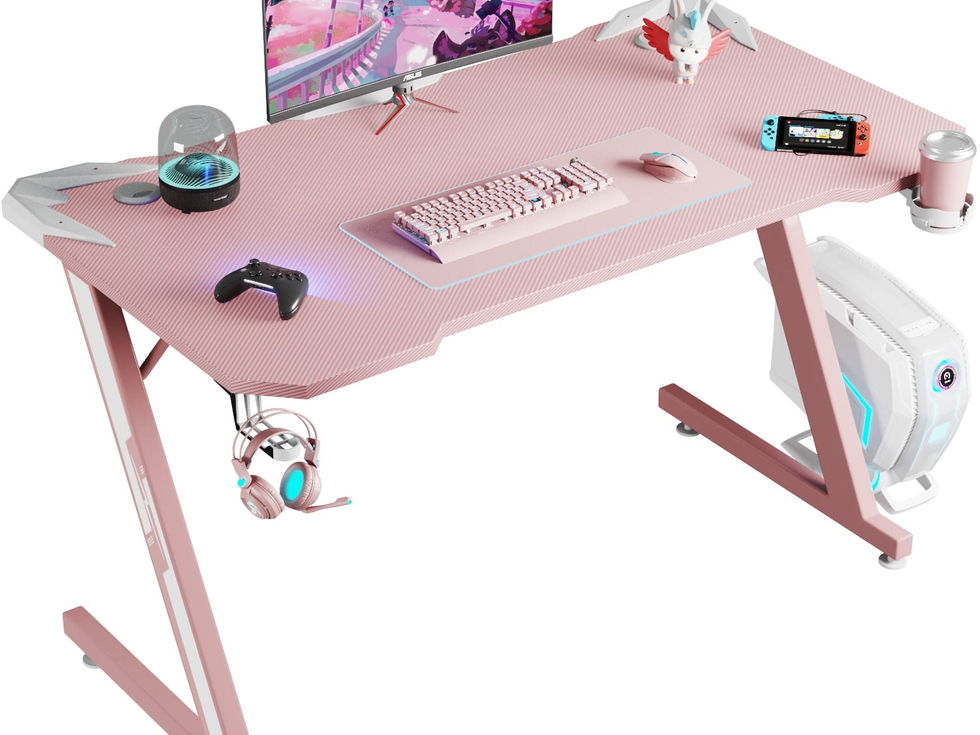 Suitable for small spaces:44"(L) x 23.6"(W) gaming desk. Enough space for essential computer equipment, suitable for smaller bedrooms, dorm rooms and apartments Convenient design: This gaming desk comes with a cup holder and a headphone hook. Convenient to place water cups, drinks and headphones. Let you have a good use experience Carbon fiber surface: This gaming table has a carbon fiber surface to replace the mouse pad, so that your mouse does not slip, allowing you to carry the whole game inside the game Sturdy Z-leg design: In addition to the Z-leg design, this gaming desk comes with two diagonal braces connecting the legs to the table top, providing strong support for this gaming desk Additional hole design: This gaming desk uses a hole design in order to make it easier for you to place the power cords of your electronic devices, so that your power cords are no longer tangled in one piece
