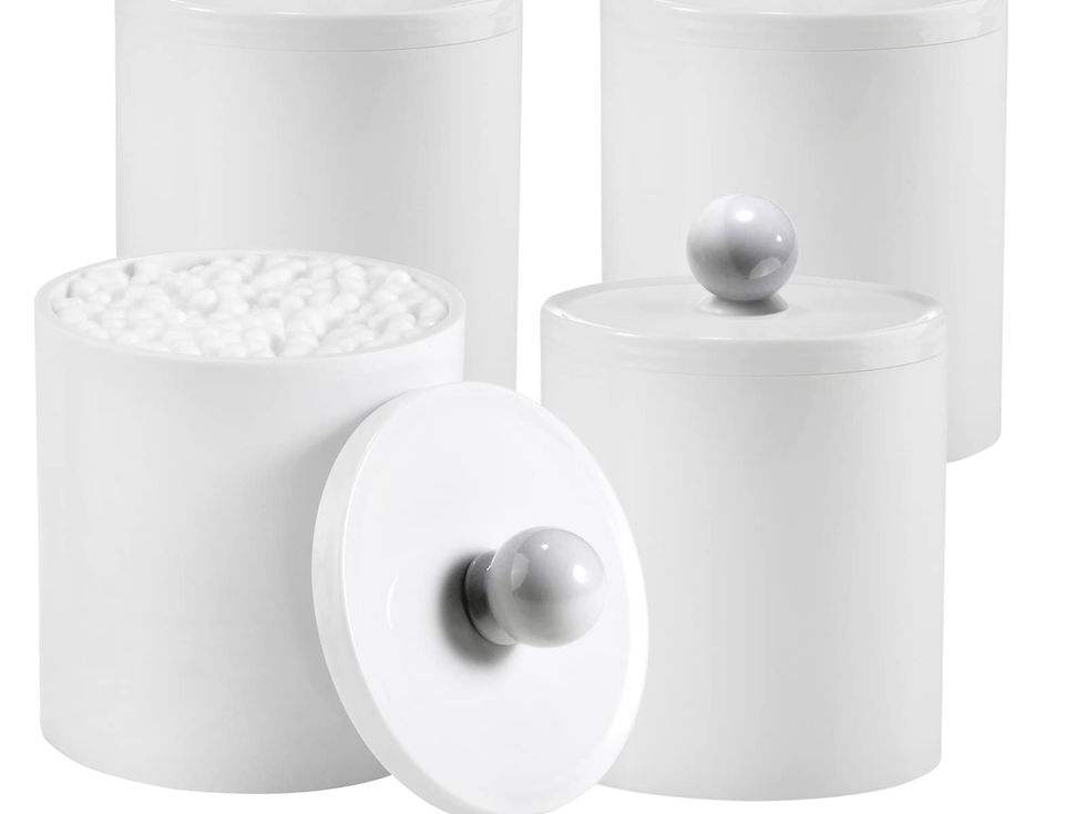 ✅CUTE AND FUNCTIONAL - The white acrylic apothecary jars combine BEAUTY with organization,going perfect for the modern farmhouse look you’re looking for in the bathroom. A rounded base provides plenty of room for storing bathroom essentials such as cotton swabs, qtips, cotton balls, cotton rounds, floss picks and is easily wiped clean with soap and water.Package includes:4 Pack of 15 ounce canisters ✅PERFECT SIZE ADN EASY TO USE- Perfectly sized for storing q-tips and cotton rounds in the bathroom. Each apothecary jar has a removable acrylic lid and a wide mouth to make accessing bathroom necessities and accessories simple.Lid fits well,not too loose or too snug,easy to set the Q-Tips perfectly in the dispenser and easy to get them out ✅MAKING HOME A BETTER SPACE - The canisters are also sturdy plastic jar, modern design, functional yet decorative,not just for the bathroom, also PERFECT in the kitchen, bedroom or craft room.Especially perfect to use in some narrow space, such as floating shelves, tiny bathroom vanity or countertop ✅DURABLE - The small apothecary jars are durable and WILL NOT SHATTER.Acrylic construction means you don't have to worry about broken glass if it gets dropped or knocked off the counter ✅SATISFACTION GUARANTEED - If you have any questions, please contact us in time, we will solve it properly for you within 24 hours.Enjoy the shopping, enjoy the better lifestyle with our qtip holder.