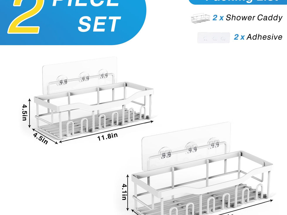 2 Hanging Shower Organizer Sets for Sufficient Bathroom Storage Space:The bathroom organizer comes with 2 pieces,including 2 big shower caddies,and 2 adhesives.Accommodate wash supplies or cooking seasonings easily with large capacities to make full use of space and facilitate your life;ideal for the bathroom organization/home decor/kitchen storage/laundry organization and storage/seasoning organizer/spice rack organizer/toilet/rv/apartment. Premium Durable Stainless Steel,Whole Hollow Design:Built with 100% premium SUS 304 stainless steel,each shower shelf for inside shower is durable,rustproof,waterproof,and scratch-proof,thanks to its high-temperature baking paint process.Last for up to 8 years,even under humid conditions.A hollow design allows for good ventilation and drainage,easy to clean.This shower rack will be the most durable product you’ve ever used. 40-Pound Bearing Weight,Reliable and Stable:The newest upgraded transparent traceless adhesives give ultra-strong reliability with up to 40 lbs of bearing weight, which is tested by professional institutions.Keep the tins and bottles in the bathroom shelf organizers, and make them easy to fetch and use.Never worry about falling issues after proper installation. Super Stronger Adhesive for Easy Installation,No Drilling:Installation only takes a few minutes,requiring no drilling holes or any tools and doing no damage to the wall.Clean the surface,stick the adhesives to the wall,and hang the shower shelves to use.Suitable for smooth surfaces like tiles/marble/glass/metal,but not for uneven surfaces like painted walls. Efficient Storage Solution for Kitchen/Bathroom:Perfect for bathroom decor and home essentials.It's a perfect choice for keeping the bathroom or kitchen items well organized and within easy reach,which is widely applied in the kitchen or bathroom.These bathroom shelves feature rounded edges to ensure they won't scratch your skin.