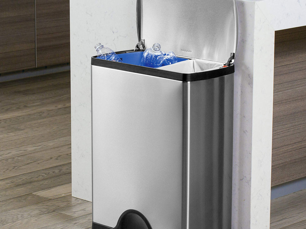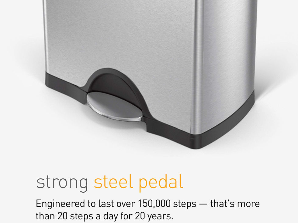 RECYCLE IT - Neatly sort your trash and recyclables in this dual-compartment can. It makes eco-friendliness very space efficient. STRONG STEEL PEDAL - simplehuman's strong steel pedal is engineered to last over 150,000 steps — that's more than 20 steps a day for 20 years. SILENT CLOSE LID - simplehuman's patented lid shox technology controls the motion of the lid for a slow, silent close. STAY OPEN LID - The lid stays open for as long as you like — perfect for longer chores. NON-SKID BASE - Non-skid base has rubber pads that are gentle on floors and keep the can steady.