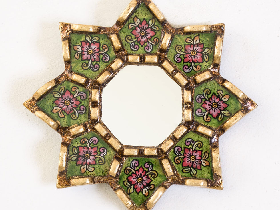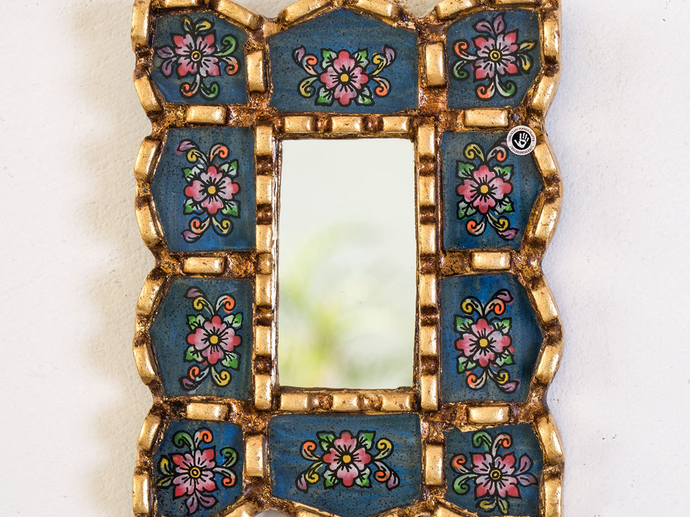 Made in Peru. Frame covered with bronze leaf accents Style: Peruvian Reverse Hand-painted Glass Materials: Mohena Wood, MDF, Glass, Bronze leaf and mirror. Ready to Hang!