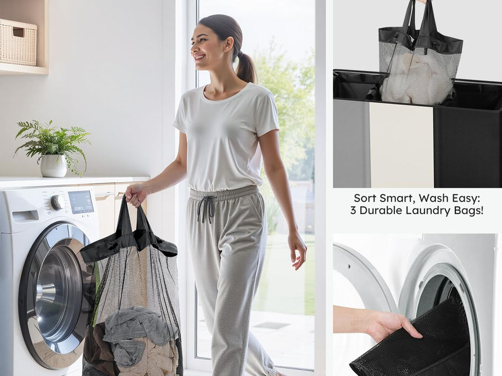 SOLEDI Laundry Hamper 3 section with lid and 3 Pcs Laundry Bag, Large