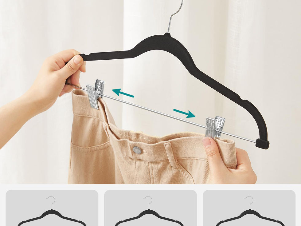 [Your Hangers Matter] Since your clothes sit on hangers for most of their life, it's necessary to choose good hangers; these quality velvet hangers are the perfect choice for keeping your clothes in good shape [Movable Clips] 2 clips can be adjusted for width (max. width: 15.6”); suitable for trousers and skirts in different sizes; attached with PVC plastic on the end to increase the friction force while protecting your clothes from clip marks [Anti-Slip Coat Hangers] Quality coat hangers with velvet surface effectively protect your clothes from slipping; grooves on the shoulder are perfect for tank tops and underwear [Space-Saving Design] Fill your wardrobe to the brim with these space-saving pants hangers; for those with a taste for shopping, these 0.2" thick slim hangers let you pack your wardrobe to its limit [What’s in the Pack] A set of 20 premium velvet hangers and a space-saving option that helps you organize blouse and trousers together using one hanger