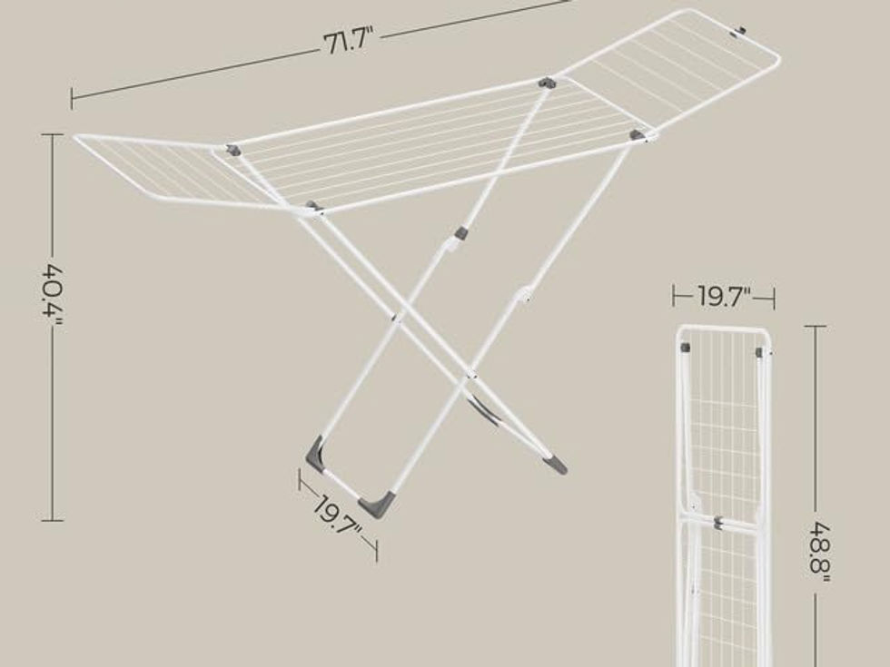 [Maximized Drying Space] Elevate your laundry game with our 19.7”D x 71.7"W x 40.4”H drying rack, featuring 59 ft of drying space across 17 rods. Effortlessly accommodate everything from small delicates to bulky linens, making laundry day a breeze [Folds Flat for Easy Storage] The foldable design of our drying rack for clothes allows it to fit into any corner seamlessly. When not in use, its compact folding size of 2.2"D x 19.7"W x 48.8"H makes storage a breeze, freeing up valuable floor space [Thoughtful Details] This drying rack features a smooth-sliding loop, a plastic clip that keeps wings securely in place when folded, and floor-friendly plastic feet [Dry Indoors and Out] Our durable laundry drying rack, finished with a rust-resistant coating, can be used indoors or outdoors. From your balcony and your bathroom to your garden and laundry room, you can enjoy a clothes-drying routine that's flexible [Energy-Efficient Solution] With this clothes drying rack, not only will you reduce your carbon footprint, but the gentle air-drying process will also keep your clothes in impeccable condition, extending their lifespan