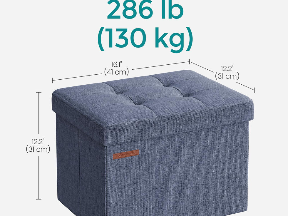 【QUICK ASSEMBLY, EASY FOLDAWAY】This storage ottoman from the SONGMICS MAZIE Collection has a foldable design that allows quick setup in seconds by simply inserting the bottom panel. Easily fold and store it under the bed or in a closet when not in use 【EXTRA STORAGE】With a total volume of 8 gallons (32 L) and measuring 12.2"D x 16.1"W x 12.2"H (31 x 41 x 31 cm), this storage ottoman is perfect for organizing your clothes, books, and magazines 【BUILT TO LAST】Made with solid MDF panels, this ottoman supports up to 286 lb (130 kg), making it a reliable piece for sitting or storing items for many years 【ELEGANT DESIGN, ENDURING COMFORT】This ottoman boasts a chic linen-look surface with an elegant tufting design, adding a stylish touch to your space. The double-layer fabric and high-resilience foam ensure lasting comfort for relaxation 【MULTIFUNCTIONAL】Use this folding ottoman for storing items, kicking up your feet, or as a handy coffee table. Perfect for the living room, bedroom, entryway, dressing room, or dorm room, catering to various needs