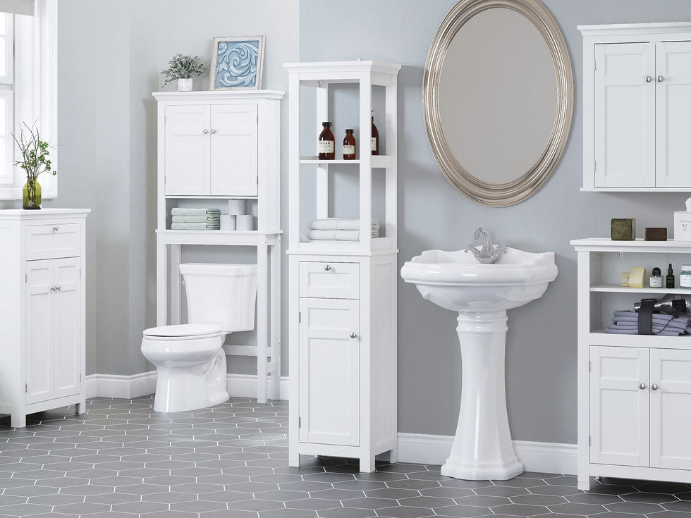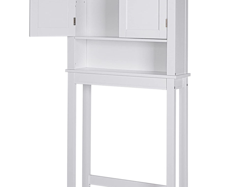 DURABLE & STYLISH: This bathroom storage cabinet over the toilet is crafted with quality MDF, durable and stable. This toilet storage cabinet features beadboard paneling and silver knobs for a classic and elegant look. AMPLE STORAGE: The over-the-toilet cabinet features a fixed open shelf and an adjustable interior shelf to store your various bathroom supplies. The mix of open and concealed storage brings more flexibility to your daily storage. STABILE & SAFE: Equipped with an anti-tip device, the bathroom shelf over toilet can be tightly secured to the wall for security and stability, avoiding the trouble of wobbling or toppling. It is designed to offer enough sturdiness and stability to provide long-lasting use. SPACE SAVER: The over the toilet storage cabinet provides large storage capacity without taking up too much floor space in your bathroom. The adjustable bottom bar fits most toilet. Overall dimensions: 27.36"(W) x 7.87"(D) x 65"(H) . EASY ASSEMBLY: Detailed instructions will guide the assembly step by step. All parts and accessories of the bathroom storage cabinet over toilet are numbered and easy to distinguish. If you have any questions or concerns, please do not hesitate to contact us for solutions.