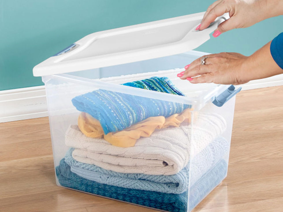 Dimensions & Size: The storage boxes have outside dimensions of 16 1/4" x 11 1/4" x 11 5/8" and interior dimensions at the bottom of 12 7/8" x 8 3/4" x 11 1/4", making them perfect for storage needs. Versatile & Convenient: Sterilite's Latching Boxes are ideal for storage needs throughout the home. Whether it's organizing your closet, bedroom, or pantry, these boxes provide a durable and secure solution. Effortless Access: The innovative latch design enables the lid to lift smoothly, as if it were hinged, allowing for easy one-handed access to your stored items. Space-Saving & Stylish: Designed with an efficient shape and modern styling, these containers save valuable space while adding a touch of contemporary flair. Clear base for quick viewing of contents and recessed lid for stacking. Sterilite products are proudly made in the USA since 1939 and are BPA and phthalate-free.