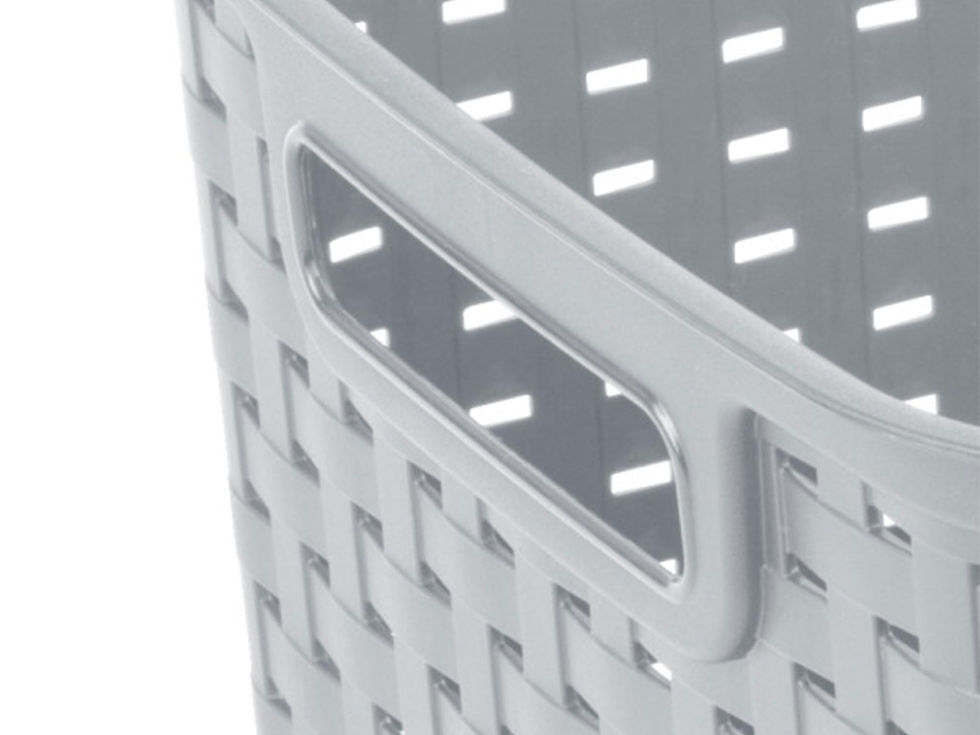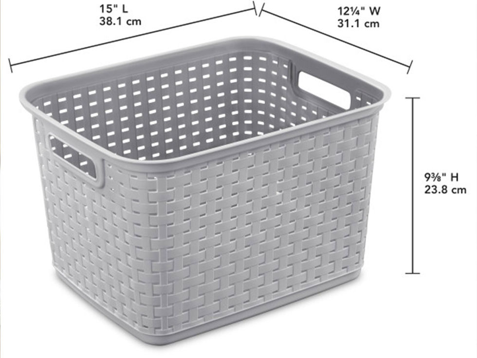 Dimensions & Size: These containers have outside dimensions of 15" x 12 1/4" x 9 3/8", providing a compact yet spacious storage solution. Stylish & Practical: Sterilite's wicker-look baskets offer an appealing aesthetic while providing the convenience of easy cleaning and durability. Made from snag-proof, durable plastic, these containers are both functional and visually pleasing. Stylish Organization: Not only do they control clutter, but each also adds a fashionable touch to frequently used areas of the home, enhancing the overall aesthetic. Convenient & Safe: Designed with through handles on the short sides for easy lifting and carrying. Sterilite products are proudly made in the USA since 1939 and are BPA and phthalate-free.