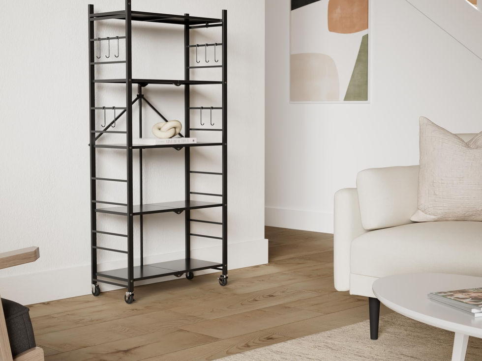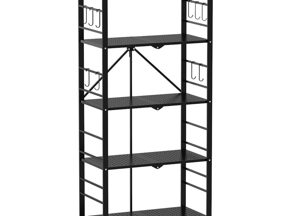 5-Tier Shelves with 20*Hook & 4*Wheels & 4*adjust feet,Humanized Size: 13.4 x 27 x 59 inches 5 Seconds to Install: Himix folding Shelves only needs 3 steps after receiving the goods: [open - install wheels or adjust feet - buckle the retainer] you can get a 5-layer shelf! No complex tools and save your time. 360°Movable Storage Rack: The movable storage rack has 4 upgraded wheels (2 wheels have locking function). You can move the Holds 2200 pounds storage rack to any position you want, and move quietly. Sturdy Construction Metal Shelves:Made of heavy duty metal iron, this durable storage rack can hold up to 88 lbs per Shelves for a total load weight of 440 lbs. Meet daily needs Save Time & Space: Want to store items to make the space tidy and orderly? Need a Shelves that can move to any scene? Himix Movable folding shelf can meet your needs. Need it? 5s to use; No need? fold back!put it in any corner or crevice.