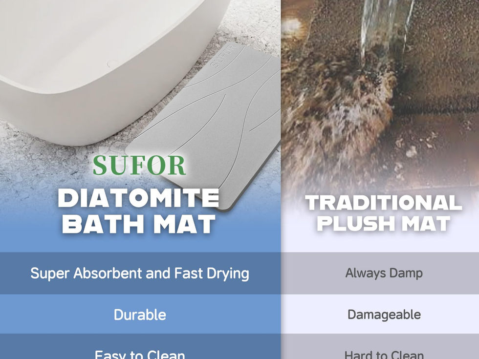 THE SUPERIOR AND NATURAL BATHROOM SOLUTION: A natural diatomaceous earth bath mat holds exceptional absorbency and moisture-wicking properties that quickly evaporate water from the surface! SAY GOODBYE TO WET AND SLIPPERY FLOORS: And say hello to clean, dry floors! SUFOR Stone Bath Mat has a quick-drying and cooling surface. PRODUCTS BUILT TO LAST: Stone Bath Mat requires minimal maintenance and is built to last a long time compared to other types of mats. Its absorbency can even be restored using a simple sanding tool. A PERFECT UPGRADE ALL AROUND YOUR HOME!: The simple and elegant design of stone bath mat makes it a perfect addition for pools, hot tubs, dish racks, pet bowls, mudrooms, and more! BETTER FOR YOU, BETTER FOR THE ENVIRONMENT: Stone Bath Mat helps you minimize your water waste as it does not require heavy washing and maintenance, and will last longer compared to fabric bath mats.they're even backed by a 12-month satisfaction guarantee!CONTACT US IF ANY ISSUES ARISE!