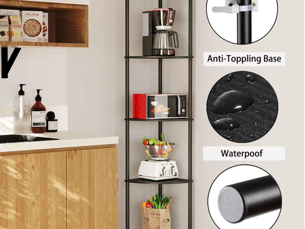 【Multifunctional Corner Shelf】: This storage shelves can be used as a corner bookshelf, display shelf, storage shelf or plant shelf in any corner of the living room, bedroom, home office, kitchen, hallway, balcony and bathroom. The 90° right-angle design of the standing shelf not only saves space, but also helps to turn unused corner space into functional storage space, perfectly fitting every corner. 【5-Tier Large Storage Capacity Corner Shelves】: The height of the corner shelf stand is 64.96 inches, the shelf radius is 12.2 inches, and the space between shelves is 14.76 inches, this tall shelf provides you with ample storage space to store Your books, photo frames, decorations, centerpieces, potted plants and other household items. 【Sturdy Stable & Durable & Safe】: This corner bookcase is made of high-grade MDF board and durable metal tube frame to ensure good quality, and each shelf can hold up to 22 lbs. The four-leg stand design and the included extra anti-tip kit secure the shelf to the wall, ensuring stability and safety for the corner book shelf. 【Urban Industrial and Fashionable Design】: The classic combination of rustic brown and black of the 5-tier corner standing shelf combines the charm of classical and modern furniture styles, showing a sense of luxury in a low-key manner. Unique wood grain finishes collide with metallic elements for an industrial feel, creating a calm and fresh vibe in your room that easily blends into any decor. The perfect combination of decorative and functional uses. 【Easy to Assemble】: This corner shelf organizer has a simple structure, and the package contains detailed instructions. Combined with the specific installation method of the corner shelves standing introduced in the video, the whole installation process is extremely simple, and the corner cabinet shelf can be assembled in about 5-10 minutes. Reminder: Please tighten each post to keep the stability of the whole corner Shelf. (We provide you with a 24-month quality assurance service)