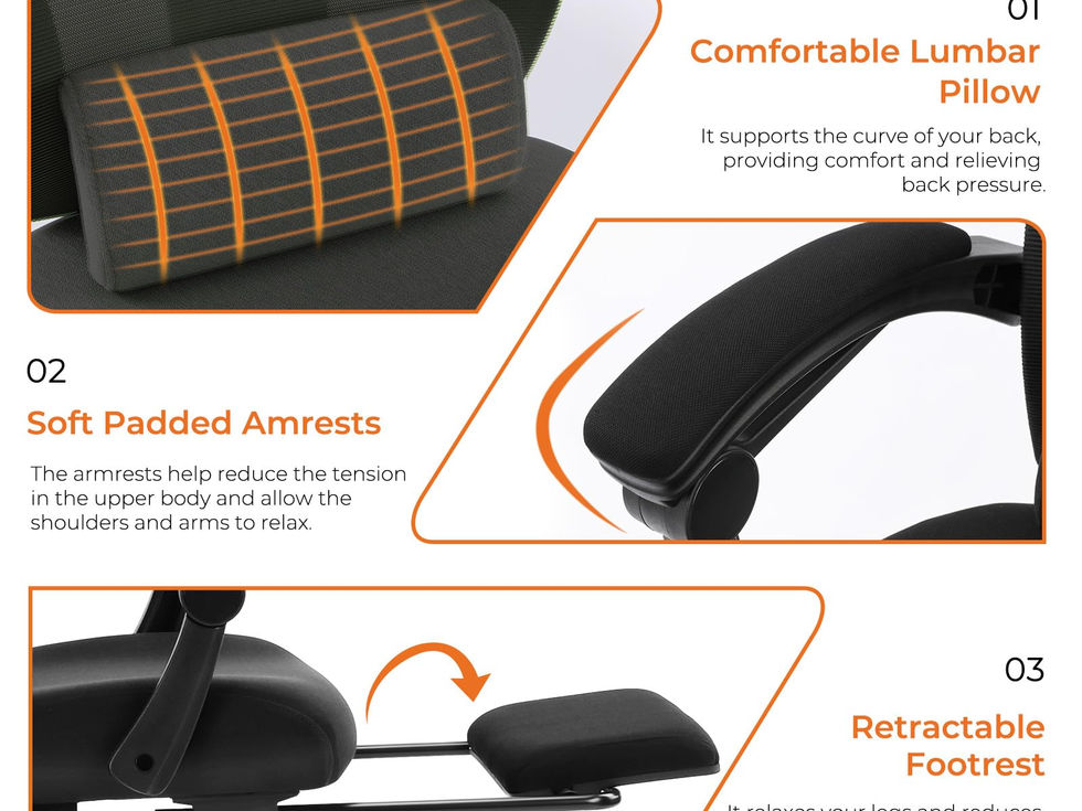 【Comfortable Sitting Experience】The ergonomic office chair with high back is designed to fit the body curves. High-density sponge filled cushion is overwhelmingly soft that you won’t get tired after long-time sitting. The soft lumbar support pillow is specifically for sedentary officers to relieve the pain on the lower back. 【Lockable Reclining Function】Push the lever up and down to lock or unlock the backrest, available for 90-135 degrees of tilt. Collaborate with a retractable footrest, the reclining office chair surely provides a super cosy lunchtime break spot, not only comfy enough for work, but also suitable for reading, game-playing and a short napping. 【Multifarious Adjustment】The height of this 360° swivel desk chair could be easily adjusted by the pneumatic gas cylinder that rises and lowers smoothly and silently. The flexible headrest of the computer chair can also be adjusted up and down, back and forth, as you like to reduce cervical pressure. 【High Quality】Featuring breathable mesh material, the ergonomic desk chair can reduce heat and sweating while the high-density cushion is deformation-resistant for longer use. Padded armrests provide for snug elbow support. 【Solid Construction】Our comfy mesh office chair with 360-degree swivel caster could run smoothly whether on tilt, wooden floors, carpets or other flooring. The strong 5-point base ensures excellent durability and stability with the maximum weight up to 250 pounds.