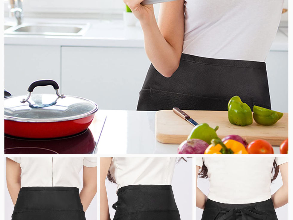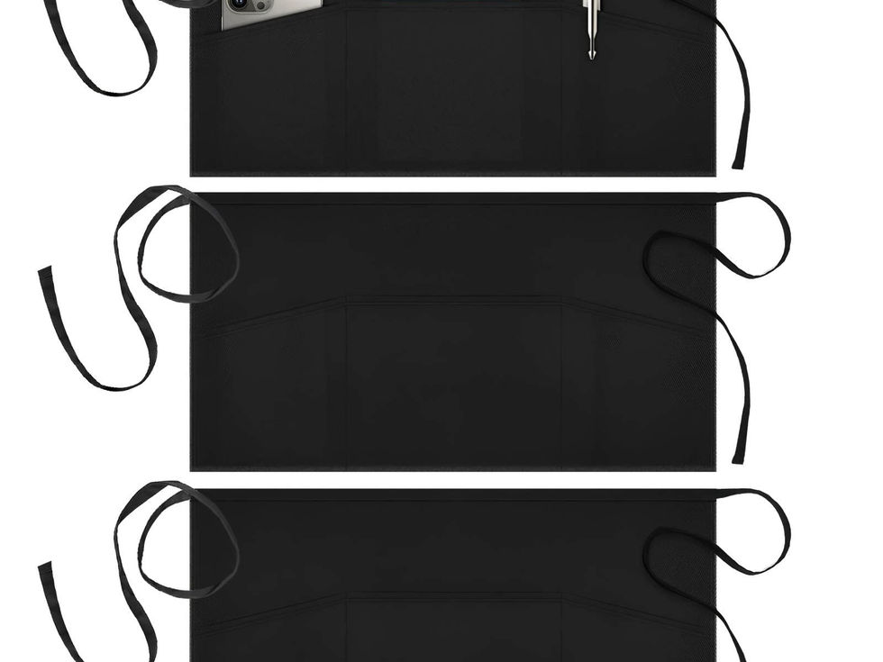 3 in 1 Design - 3 pockets in the apron with the bigger one sewed in the middle and two oblique pockets on both sides. Enough for storage. 100% Cotton Material - Soft, stylish, lightweight but durable with a smooth touch. Keep you from stains. Multi Application - Suitable for cleaning, serving, cooking, baking, crafting and gardening as well as seamstress work, etc. 3 Pack - Set includes 3 waist aprons in black. Convenient to change and wash. Note - Machine washable; Wash with brunet cloth; Bleaching, dry cleaning and tumble drying are NOT allowed.