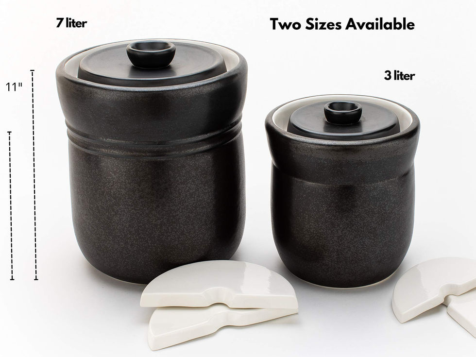 ✔️ SUPERIOR QUALITY: TOMO Stoneware combines innovative design with traditional, quality craftsmanship. Make nourishing, probiotic rich foods like german sauerkraut, pickled vegetables, kombucha, and kimchi at home. Every detail was considered to develop this restaurant-grade fermenting and pickling crock. KIT INCLUDES: 2 weights and wooden tamper. ✔️ DURABLE CERAMIC WALLS: We sourced the finest natural earthenware and rigorously designed our vessels to last a lifetime. Earthen ceramic blocks UV light so all nutrients and healthy enzymes remain intact for maximum sour deliciousness! ✔️ WIDE WATERLOCK SEAL: The seal creates an oxygen-free environment where gases can escape while keeping air out. TOMO's extra-wide waterlock reduces the need to constantly refill the seal and enjoy delicious results every time! ✔️ PREMIUM GLAZE: Fully glazed inside to prevent odors from developing. Our crock is made of high quality ceramic that is non-porous and will not craze. Easily clean with warm soap and water. ✔️ FERMENTING CROCK SIZES: 3L (1 Gallon) fits 2-3 cabbages to make 5 mason jars of sauerkraut. 7L (2 Gallon) fits 5-7 cabbages to make ~12 mason jars. As Kombucha Fermenting Vessel, makes full 3L or 7L.