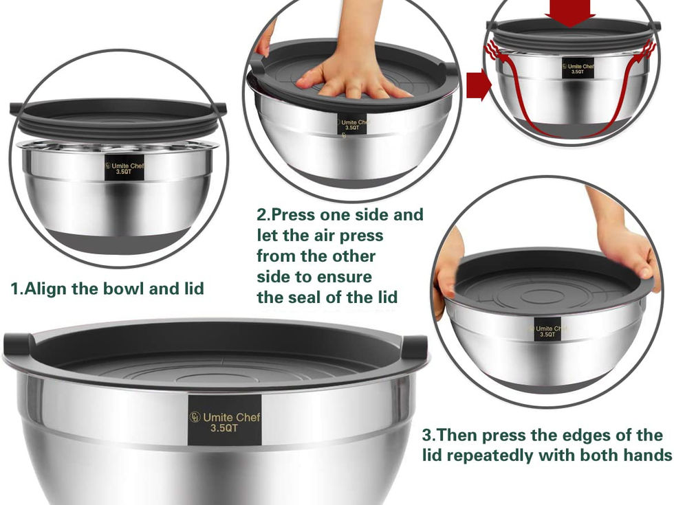 PREMIUM MATERIAL: Each bowl is made of high-quality heavy gauge stainless steel, which is resistant and rustproof. Umite Chef mixing bowls feature a mirror finish interior and fingerprint-proofexterior. High-quality food grade stainless steel, you and your family can ues it with peace of mind LARGER BOWL SIZES: Our stainless bowls deeeper than standard bowl sets, allow for larger servings . This set contains sizes1.5, 2.0, 2.5, 3.5, 7 quarts, that gives you much more flexibility, and less mess, satisfy your demands for mixing large batters, tossing salads, washing vegetable, marinating and storing, etc DISHWASHER SAFE: The silver bowls feature a shiny interior and fingerprint-proof satin exterior, Which are simple to clean by hand and are dishwasher safe NON SLIP SILICONE BOTTOMS: Flat silicone bases prevent the metal bowls slippage when mixing, you need not to worry about the bowls will wobble when mixing, beating and whipping. TIGHT-COLORFUL LIDS: Flexible BPA free plastic lids closely fit the bowls, keep your food fresh, tight fitting lids are great for food storage, great choice for storing food for longer.