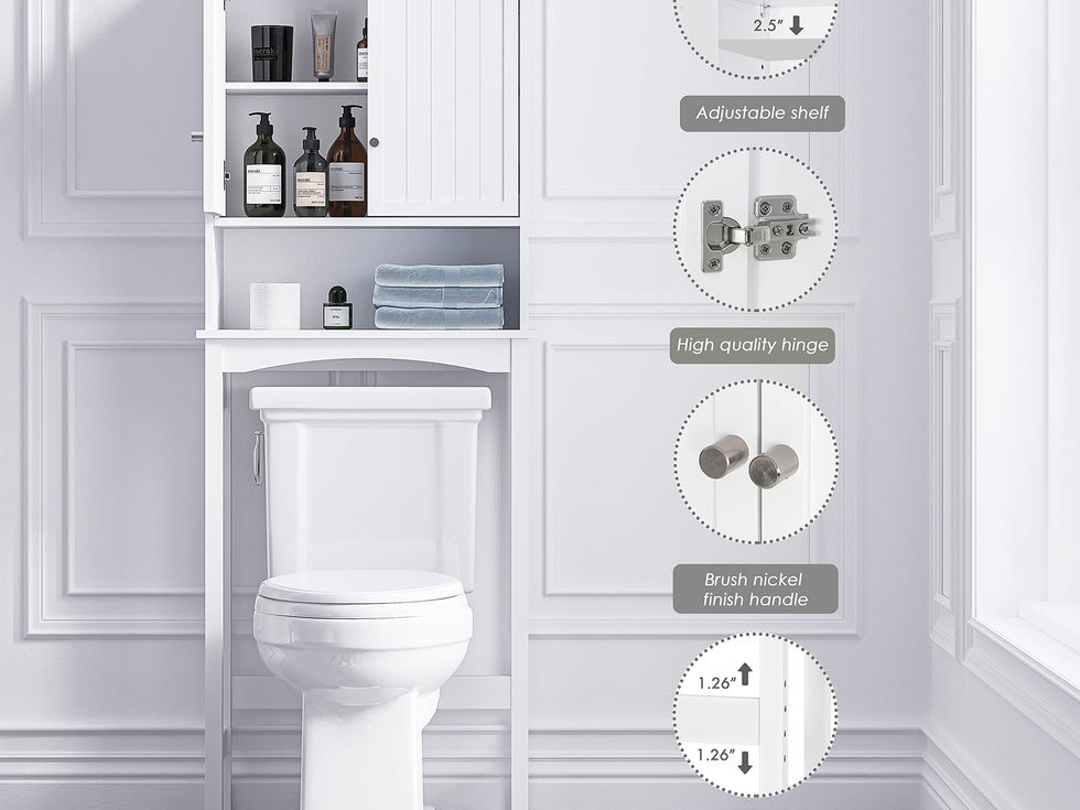 High-quality toilet storage: UTEX over the toilet storage cabinet is made of high-quality MDF, and is equipped with an anti-tip device, which is strong and durable and a good choice for your bathroom. Adjustable toilet shelf organizer: The cabinet over the toilet has a removable and adjustable wooden panel inside, so you can adjust it appropriately to place different toiletries according to your needs. Modern style storage over the toilet: This bathroom above toilet cabinet is simple in design and elegant in shape, suitable for any home decoration style. Suitable size: The overall size of the wooden bathroom toilet rack is 9"D x 24"W x 62"H, which perfectly fits most toilets. Easy to install: UTEX bathroom shelves over the toilet are simple to assemble, easy to clean, and you can have a self-contained bathroom toilet storage cabinet in an hour.
