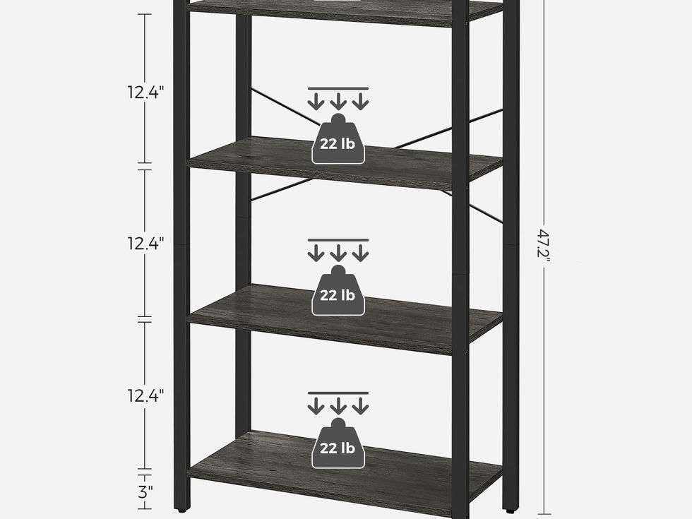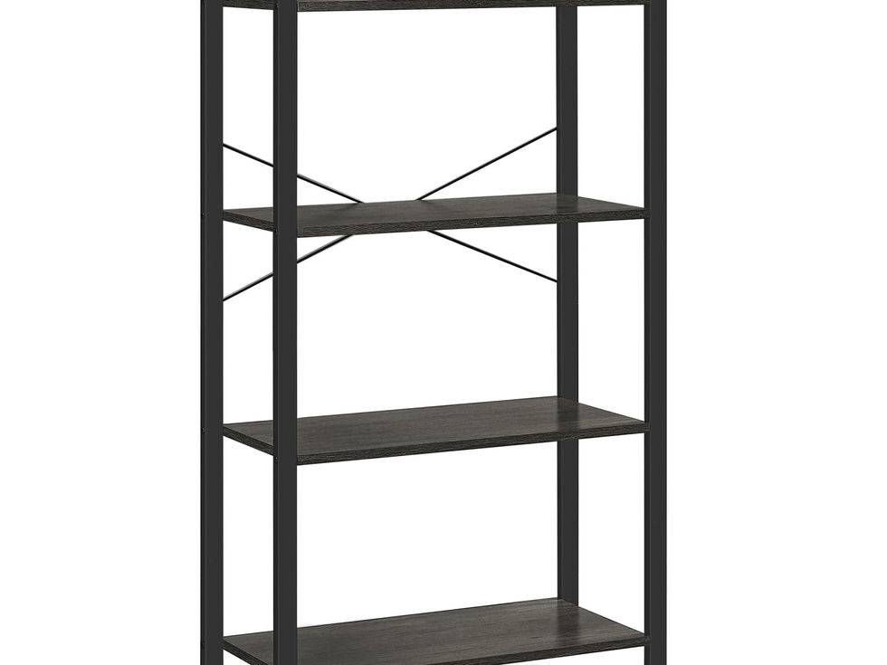 [Space-Saving for Any Room] This 11.8"D x 25.9"W x 47.2"H bookshelf occupies little floor space yet offers you 4 tiers of vertical storage, making full use of the small spaces in your living room, bedroom, bathroom, or entryway [Built to Last] A smart mix of quality particleboard and a sturdy steel frame allows this robust 4-tier bookcase to hold up to 88 lb, giving your items reliable support for years to come [Easy Assembly] With easy-to-follow instructions and labeled parts for easier understanding, you’ll spend less time assembling this display shelf than deciding which book to start reading! [Stable and Safe] X-shaped bars reinforce the structure, adjustable feet keep this tall book shelf balanced on slightly uneven floors, and the included anti-tip kit will help you fix it to the wall for greater stability and safety [Embrace an Industrial Vibe] The gray shelves paired with a black steel frame create a stylish industrial look, allowing this freestanding shelf to fit seamlessly in with your home decor and give your space an instant update