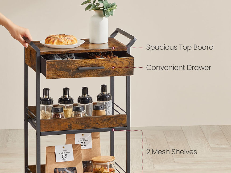 【ROBUST AND STABLE】Constructed with a quality steel frame, this rolling storage cart is designed to support up to 66 lb per shelf and top tray, and 22 lb in its drawer. Its solid construction ensures it can securely hold a large number of items 【SPACIOUS STORAGE】Featuring a large top board for work or belongings, a privacy drawer to keep out dust, and 2 ventilated mesh shelves, this storage trolley offers ample space for all your needs 【MOVABLE, SECURE, SAFE】This utility cart, equipped with 4 lockable casters and handles on both sides, is easy to move and lock in place. Raised edges and guard rails prevent items from falling off, ensuring safe transport 【MULTIFUNCTIONAL】This versatile rolling cart can be used in the bathroom, dining room, bedroom, as a tool cart, book cart, service cart, and more. It enhances your space and becomes an indispensable ally! 【EASY ASSEMBLY】This storage cart on wheels comes with detailed and clear instructions, making assembly quick and effortless, saving you time and hassle