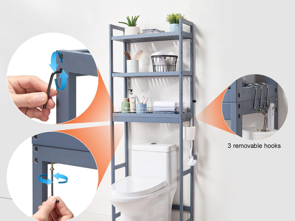 Compatible with Most Toilets: Our frame design can accommodate various types of toilets. This over the toilet storage rack measures 24.8" x 10.2" x 66.9" (630 x 260 x 1700 mm), making it suitable for limited bathroom spaces. The bottom crossbar can be adjusted to 3.4" (85 mm) or 6.2" (158 mm) from the floor, ensuring it doesn't block pipes. The bottom shelf is 38.6" (980 mm) above the ground, allowing the toilet lid to open fully and move freely. 3-Tier Over-toilet Storage Rack: This 3-tier storage rack offers large capacity storage space with three preset height positions for the middle shelf. You can flexibly adjust the middle and bottom space according to the height of your items. Each shelf can hold up to 33 lbs (15 kg), helping you keep towels, shower gel, potted plants, and other bathroom items organized. It comes with three detachable hooks for conveniently hanging tissues, bath balls, and foam nets. Sturdy and Stable Structure: With 2 sets of reinforcements, the over the toilet storage shelf is prevented from shaking and tipping over, ensuring safety. The storage rack is made of sturdy bamboo, combined with a painted surface, making it more durable, smooth and waterproof. The carefully crafted support frame is 0.6" (15 mm) thick, ensuring it doesn't deform with use. Easy Assembly: Even if you are not handy, you can easily assemble and set up this bathroom toilet rack. First, assemble the overall frame, then adjust the middle shelf and bottom bar position according to the preset holes, and finally secure the reinforcements to the wall. Our clear instructions and included tools make the assembly process much easier. Multiple Home Applications: This over-the-toilet space saver with a spacious lower area can also be used above washing machines, potted plants, and other items to store miscellaneous items, shoes, books, plants, spices, and small appliances. It is available in three colors: gray, white, and bamboo, with simple lines that create a tidy space in your living room, bathroom, kitchen, and balcony, adding a touch of elegance to your home decor.