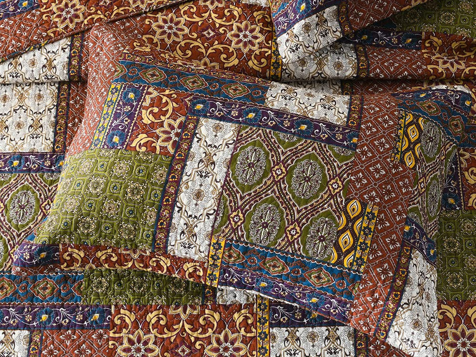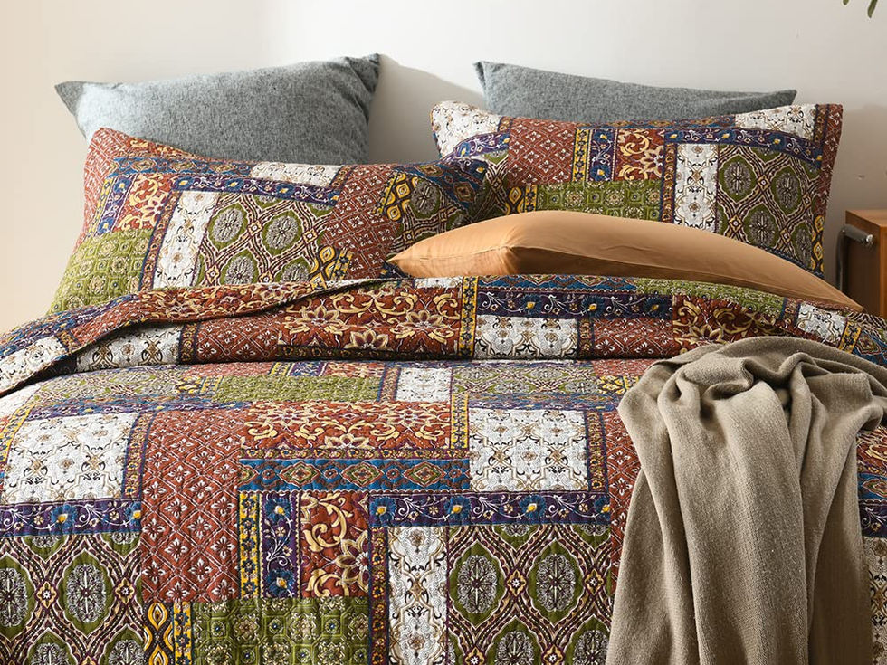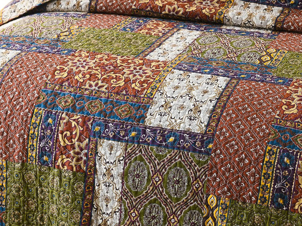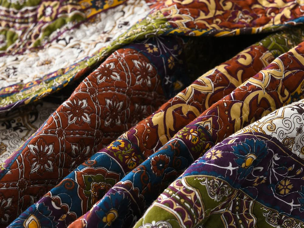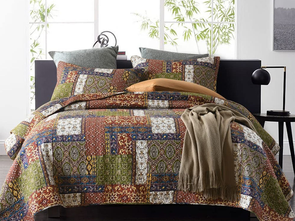 100% cotton fabric both in covers and fillings. Special splicing handmade craft with intense stitching process making the patchwork bedspread more durable and comfortable. Vintage brown bohemian patchwork pattern making your room more elegant and charming, creating a wonderful bedroom space 3 pieces quilt sets: 1 queen size bedspread (90 by98 Inch) with 2 Pillowcase (20 by27 Inch). The bedding set designed with double stitching technology, tight seams will not unravel, keeping the quilt in place and not wrinkle or shrink even after washing. Reactive printing process for clearer patterns and brighter colors.