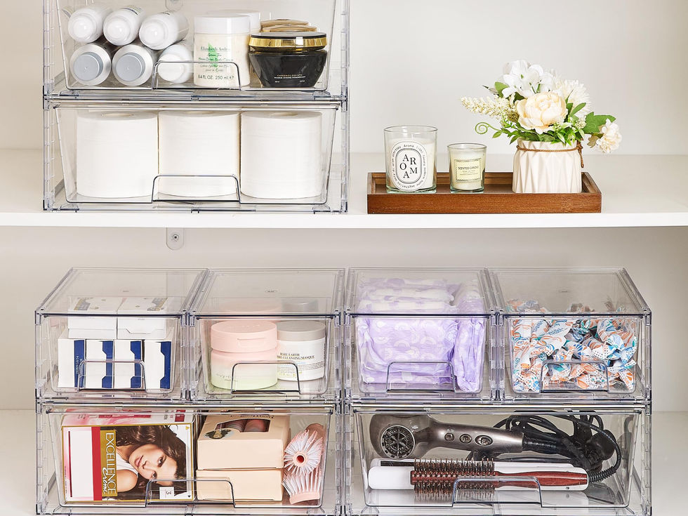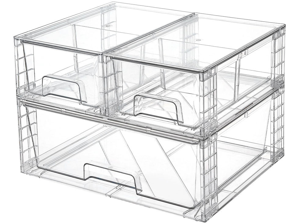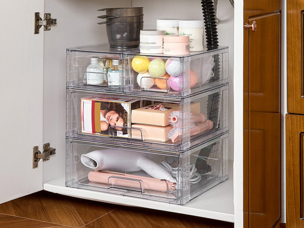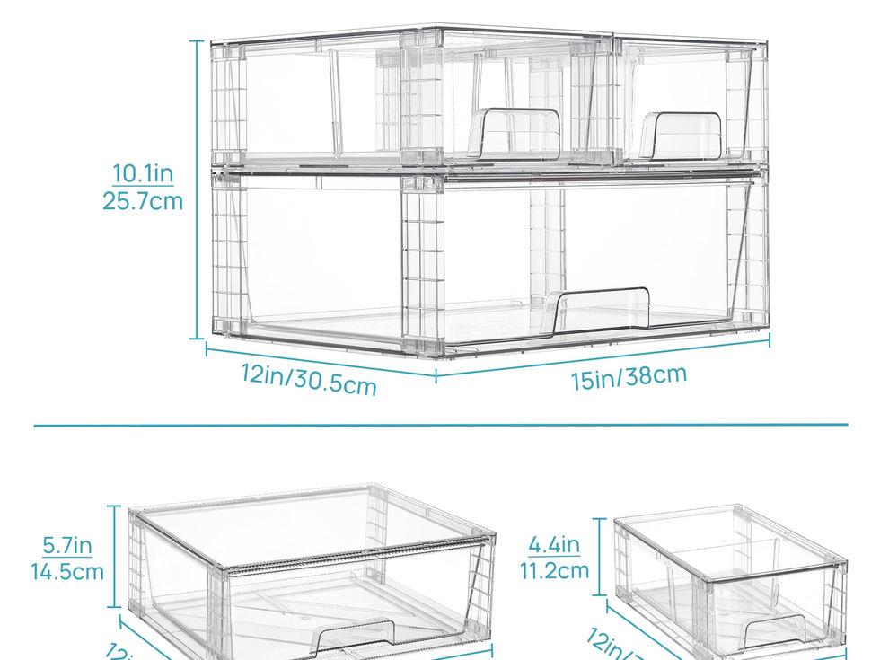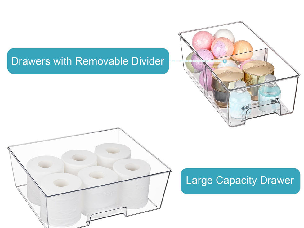 【Stackable Storage Drawers】The top of the drawer features a groove design that ensures secure stacking,saving space. You can place other items on top of the plastic bins to maximize tidiness in your under-sink or cabinet spaces. 【Acrylic Organizer Bins】Comes with 3 storage drawer organizers, including 12"D x 15"W x 5.7"H (1PC) and 12"D x7.5"W x 4.4"H (2PCS) to suit your various storage needs. The 15"W clear drawer storage is ideal for storing hair care tools, paper towels, and bathroom supplies. The 4.4"H clear drawer storage, featuring a removable divider, is perfect for organizing cosmetics, medicines, office supplies, snacks, fruits, and more. 【Anti-slip & Install Easily】These stackable organizers feature built-in sliding rails, allowing you to open and close the acrylic drawers smoothly. Provided non-slip silicone stoppers at every base to prevent the bathroom countertop organizer from moving around, even when pulling out a drawer. Just insert the connecting holders into the grooves of the bottom plates and secure the upper plate, enabling quick installation. 【Multi-purpose Organizer】These storage boxes are ideal for keeping your home organized. The combination of 2 sizes makes this bathroom organizer versatile for multi-purpose storage and organization. It can be used for bathroom organization, cabinet storage, closet organization, pantry organization, under-sink storage, baby bottle organization, and more. 【Clear View & Durable】The storage containers are made of PET plastic. Visual organizer bins allow you to see the inside clearly and find the desired items quickly.