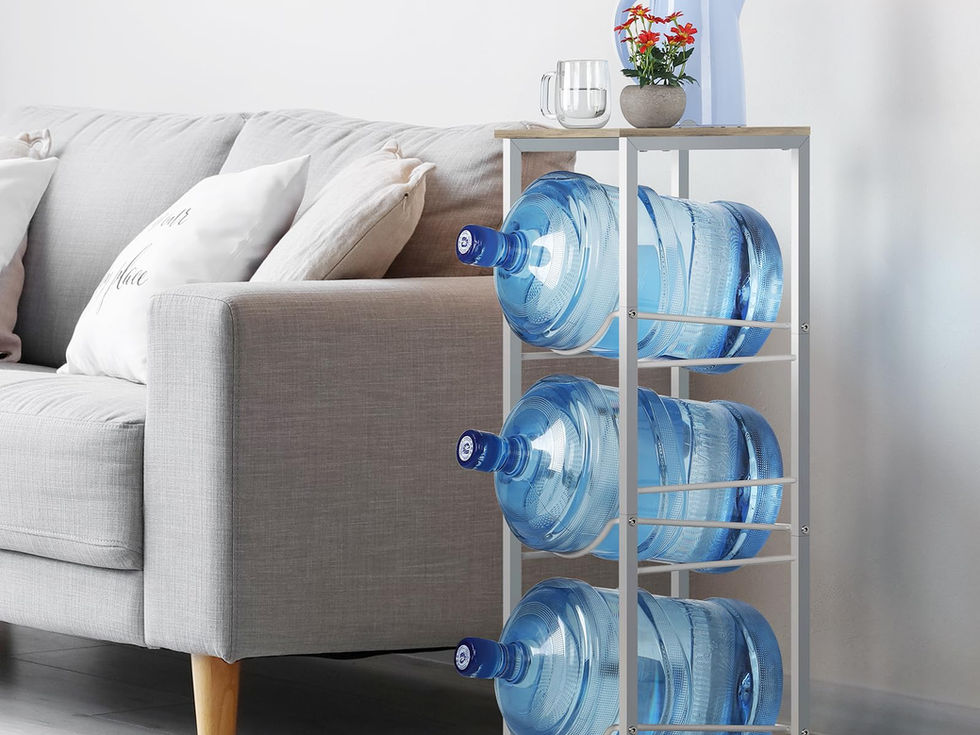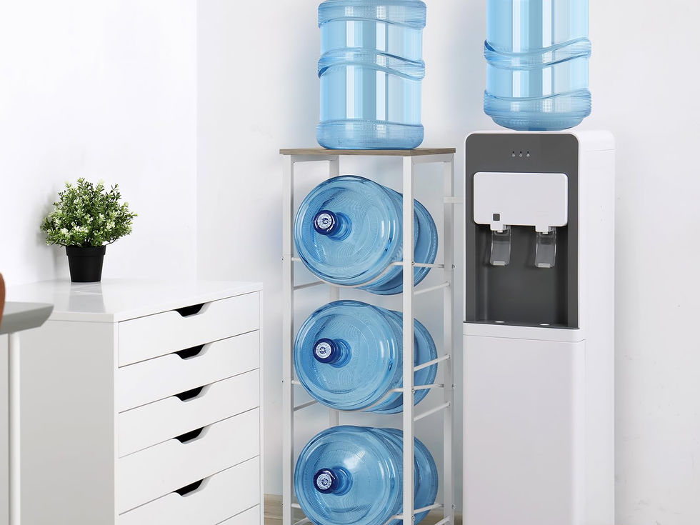 【Premium Material】This 5 gallon water jug stand is constructed with strong particleboard and premium durable steel with white paint, which is rust-proof, durable, and corrosion-resistant. Sturdy and durable structures make the water bottle organizer used for many years. 【Save Space 】 The water stand for 5 gallon bottle measures 12.9''L x 12.99'' Wx 38.5''H, and each bottle rack holds up to 3 5-gallon water bottles. You can put the water dispenser stand in your kitchen, office, classroom, living room, restaurant, etc. The water bottle rack can organize your water bottles to keep your home neat and clean while saving your floor space. 【Updated 5 Gallon Water Cooler Jug Rack】This water bottle storage rack features a rustic brown MDF board that comes with a black metal frame, which is a real combination of modern and exquisite retro style. Such a simple and practical design enables our 5 gallon water jug holder would catch guests’ eye at a glance. 【Floor Protection】 This 5 gallon water bottle rack comes with 4 adjustable feet, not only preventing your floor from getting scratched but also keeping the 5 gallon water storage rack can stand firmly on an uneven floor. 【Easy Assembly & Service】Simple design makes assembly very easy. Necessary hardware and instructions are provided, you just need to follow the instructions to complete the water jug rack in 15 minutes. If the 5 gallon water bottle stand is defective, please feel free to contact us and we will send a new water gallon holder for free or refund
