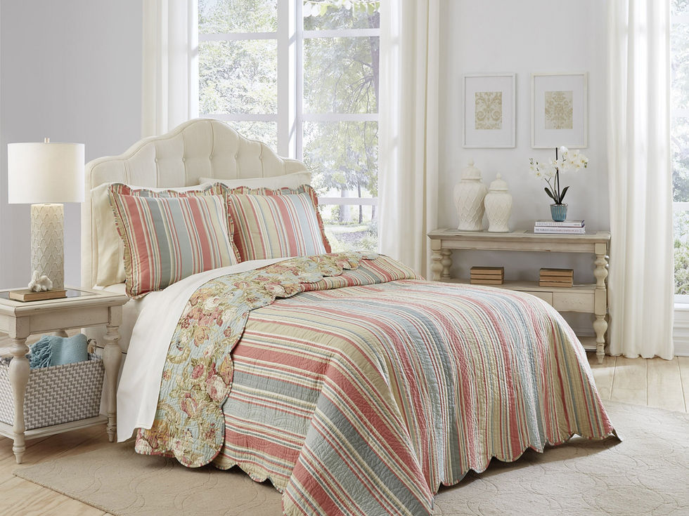 BEDDING SET - Full/Queen size bedspread set includes one reversible bedspread (96" x 110") and two coordinating reversible pillow shams (21"x 26") BEAUTIFUL DESIGN - This bedding offers a large-scale classic floral pattern in delicate hues of vintage red, blush pink, vapor blue, parchment, taupe, and sage green. It reverses to a coordinating variegated stripe MATCHING SET - Complete the look by layering coordinated bedding, accent pillows, and lined window treatments, all finished in Waverly's Spring Bling style CONVENIENT CARE - A 100% cotton, easy-care bedding set that you can put in the washing machine with like colors. Wash in cold water on the gentle cycle and tumble dry on low. Use non-chlorine bleach, do not dry clean. Warm iron pillow shams or bed skirt if needed TRUST WAVERLY - A renowned brand synonymous with elegance and quality, Waverly can help you upgrade your space with confidence. Embrace the delightful blend of style and comfort, and make your home a haven of relaxation and indulgence