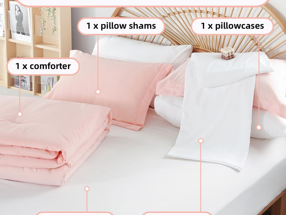 【Luxury Design】Update your bedroom décor with the twin comforter set. This simple yet fashionable style features a boho blush solid color that will match your decor nicely. Weigelia pink solid bed comforter set makes updating your bedroom space easy. 【What You Can Get】5 pieces twin comforter set comes with everything you need: a comforter(66" * 90"), 1x Pillow sham( 20" * 26"), 1x Pillowcase( 20" * 30"), 1x Flat sheet(66" * 96"), 1x Fitted sheet(39" * 75" *14"). 【Soft Material】The fluffy comforter set features tightly woven and double soft microfiber contributing to a silky soft feel, lightweight, and breathable. This bedding set's soft-to-touch fabric adds to overall comfort and will help you sleep all night. 【Perfect for All Season】Our bed comforter set is lightweight and soft, adding a layer of warmth to your perfect sleep. The weight of the comforter makes it a great choice for all-year-round use. And boho bed comforter can easily complement all room styles and is an ideal gift for family and friends. 【Easy Care】Machine wash cool using mild, liquid Laundry Detergent. Do not bleach. Iron on low heat if needed. Tumble dry low. Our bed comforter could stand up to years of use with proper care.
