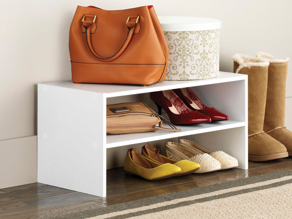 Blend function and modern design to add a new storage option to any closet 2 shelf shoe rack is able to store up to 9 pairs of shoes Store shoes and accessories on this stackable wood storage rack Assembled Dimensions: 11.61 L x 24.0 W 11.61 H inches Easy to assemble with tools included in package