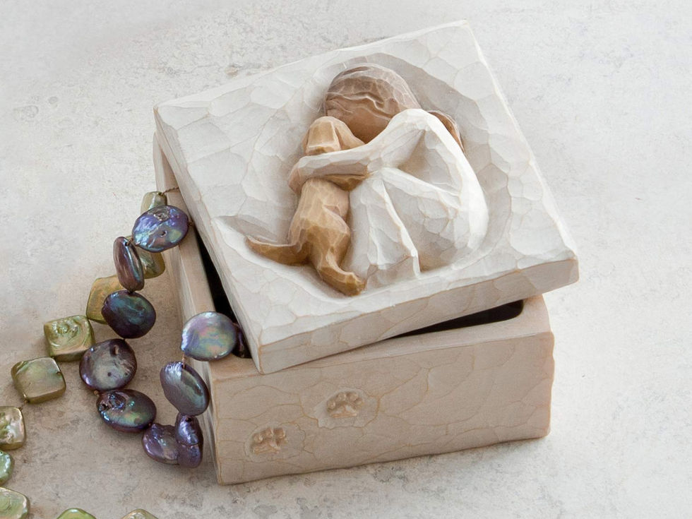 Sentiment written inside box: ”Truly a friend”. Includes Enclosure Card 3”square x 2”h hand-painted resin box. Bas-relief carving of seated figure in cream dress, playing with yellow dog on lid (not attached) fitted to a cream square box. Inside, the bottom of box reveals a message of love and friendship as a hidden discovery. Packaged in fitted box ready for gift-giving. Artist Susan Lordi hand carves the original of each Willow Tree piece from her studio in Kansas City, MO. This piece is cast from Susan's original carving and painted by hand. Ready to display on a shelf, table or mantel. To clean, dust with soft brush or cloth.
