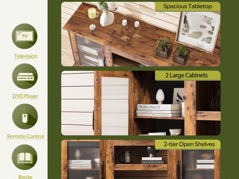 【Retro TV Stand】58 inch TV Stand with concise line, corrugated acrylic cabinet door design, Superb light transmission yet non-perspective, increase interior beauty. Metal handles show vintage and elegant charm, this cabinet will perfectly updated your house decor. 【Ample Storage】 The cabinet space on the both side of the Entertainment Console is equipped with 3-level adjustable shelves, enough to hold your game consoles, set-top boxes and DVD players. The door design allows you to receive remote control signals even when the door is closed, bring more convenience to your leisure time. 【Solid & Durable】Choose high-quality particle board, 3-inch thick bottom can provide stable bottom support, the maximum load of the top can reach 110lbs, enough to put up to 65-inch TV and other daily needs. 【Cable Management】Triangular cable holes behind the cabinet allows you to organize the mess wires easily.Keeps cable storage neat and tidy. 【Same Style Fireplace TV Stand Available】If you fall in love with this Wood TV stand, WLIVE fireplace TV stand of the same style is coming soon, warm up your living room and enhance the tone.