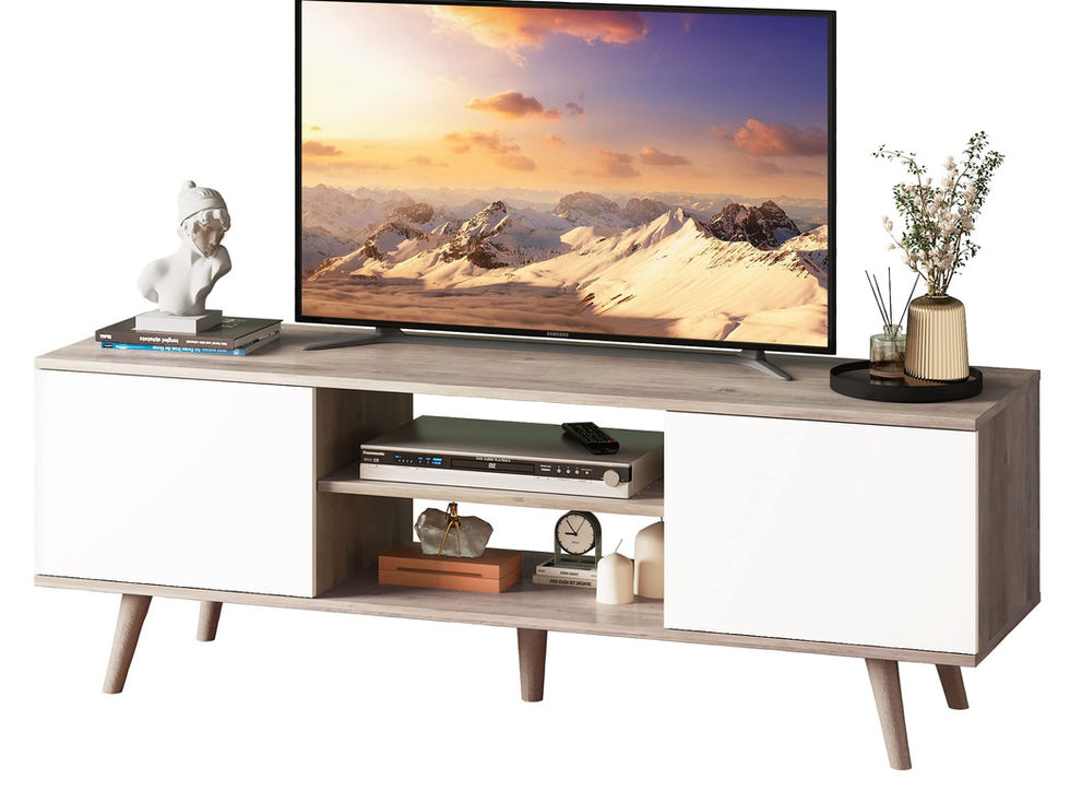 【MODERN TV STAND】Stylish and modern, this white tv stand features a unique embossed wood grain. This TV console for 55 inch TV can fit in well with most style of home decors. 【SOFT CLOSE DOOR】Equipped with soft-close hinge, this entertainment center is safe, don't need to worry about hurting your fingers, it only takes a gentle push to close the door without pinching hands or making noise. 【LARGE STORAGE SPACE】Along with an open-layer frame, each black TV console with 2 storage cabinets is perfect for storing video games, remote controls and more, keep items orderly and organized. 【3-LEVEL ADJUSTABLE SHELVES】Removable open shelf can be adjusted according to the tv box, router, game console and other TV components accommodated. 【CABLE MANAGEMENT】Holes in the back allow cables for various devices to pass through. Crafted from engineered wood, this wood TV stand is stable and durable, foot pads on the legs avoid scratching your floor.