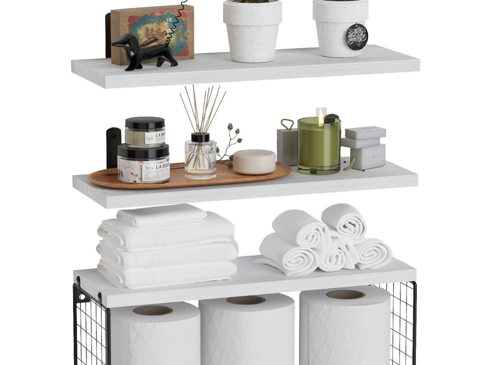 NOTE: **Included 4 L-shaped Metal Bracket**NO Pre-drilled Holes** 2-in-1 Floating Shelves with Toilet Paper Basket - The size of the floating shelves basket is 16.5*6*5.5 inches, which can store 3 rolls of toilet paper, other small objects, and towels. Our storage basket of bathroom floating shelves is made of iron wire with a powder-coated finish, which is more solid and won’t rust. It fits the humid environment. These wall-mounted floating shelves with a grid design will reduce dust accumulation, and keeps the toilet paper clean and dry. Wood & Wall Mounted Design - Our bathroom floating shelves with basket are made of wood which grows naturally, so each piece of the board has unique wood grain and color. Through the simplest charcoal roasting process, we restore the carbonized color and texture of the wood itself. Our bathroom floating shelves make full use of the wall, and let your room and bathroom look so cute. Sturdy & Easy to Assemble- The L-shaped metal brackets are solid, with a capacity of 40Lb. You don’t need to worry about it falling off. WOPITUES wood floating shelves for bathroom have gourd-like screw holes wall-mounted design. After nailing the wall, you just need to hang it on. WOPITUES wood floating shelves for bathroom are super sturdy, very easy to install, and less damage to the wall. (Note: For the best installation, we suggest leaving the nails out of the wall for 0.1 inch.) Rustic Farmhouse Style - Our farmhouse style rustic floating shelves for bathroom measure 16.5*6*0.6 inches(**no pre-drilled holes**), which can provide an extra storage space wherever needed. WOPITUES floating wall shelves with basket fits rustic/modern farmhouse style, traditional/industrial style, vintage style, or minimalist style. Add some warm and sweet atmosphere to your bedroom, living room, bathroom, office, and kitchen. You can use it as a corner shelf, floating plant shelf, book shelf, and cat shelf.