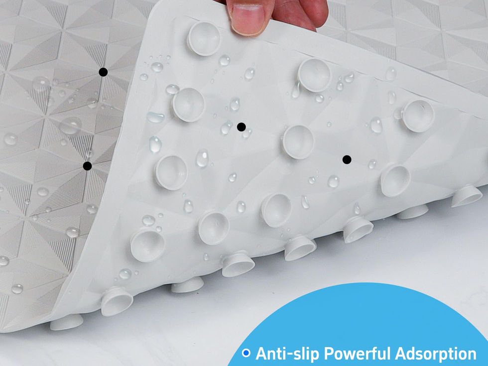 NEAT AND ELEGANT: Rhombic concave-convex texture forming multiple squares/hexagonal star distribution, enriching the visual expansion and giving a strong 3D and layered feel; whatever your style, this luxurious bath mat will bring elegance to your bathroom NATURAL RUBBER: Sourced from natural rubber trees in Brazil, skinfriendly and PVC/TPE/BPA/EVA/Latex free; anti-odor, stain-resistant, machine-washable and quick air dry; and best of all, it won't harden like plastic ones WITH DRAIN HOLES: Multiple drainage holes speed up air circulation, diverting residue away from the mat and into the drain, preventing water and soap residue from accumulating around the product 241 HIGH-INTENSITY SUCTION CUPS: With optimal suction cup size and spacing, and 4 times more suction cups than other brands, our non-slip bath mats ensure your safety even in the most slippery conditions ANTI-SLIP MASSAGE TEXTURED: Unlike plastic, our rubber shower mats provide good shock absorption and are paired with massage bumps that to relieve foot fatigue, and provide extra grip to reduce the risk of slipping