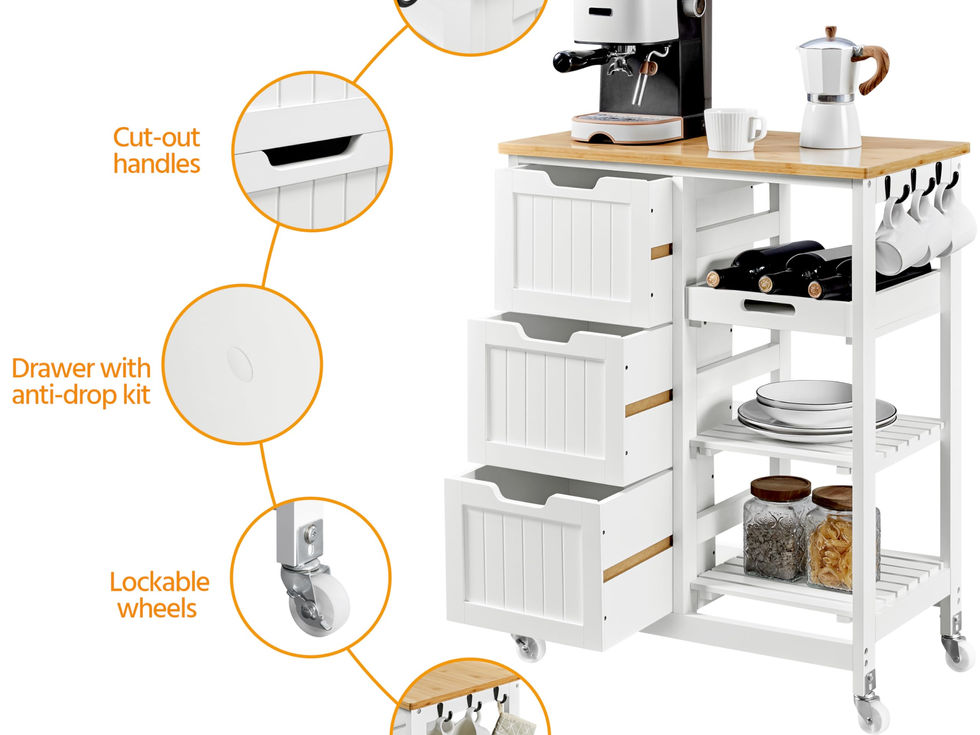 Made for Durability & Easy Maintenance: Constructed with solid wood and CARB P2-compliant MDF, this kitchen cart showcases a sturdy top and solid wood legs, ensuring a total weight capacity of 165 lb Detachable Tray with Handles: This versatile kitchen island incorporates a tray with cut-out handles into its shelving unit. The tray can be detached from the cart and used as a breakfast/serving tray Must-have Mobility: Stands on four universal wheels (two with locks), this rolling kitchen island boasts effortless maneuverability and can be locked into place for extra stability Handy Organizer: As a must-have item in a busy kitchen, our kitchen island trolley provides a spacious countertop, three drawers, three open shelves, and six side hooks for storing kitchen essentials Simple & Neutral Design: With a neutral color tone and a simple look, this mobile kitchen island will not easily clash with the current kitchen design. It can also serve as a flexible breakfast nook or a small coffee bar
