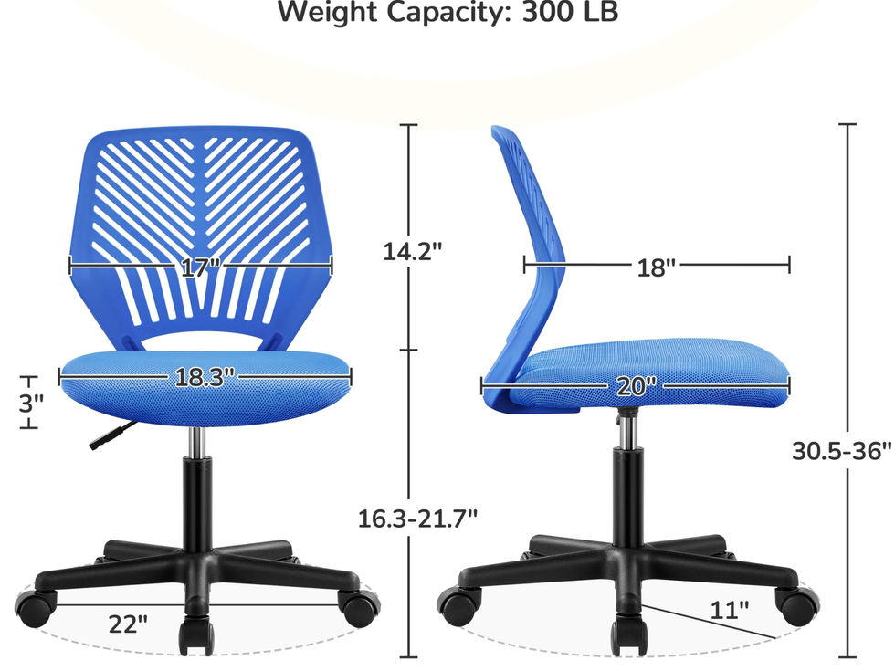 Comfort and Robust: This mid-back office chair features a spacious foam-padded seat measuring 18.3″ W, 18″ D, offering ample space for a relaxed sitting posture. With its sturdy construction, it supports up to 300 lb, ensuring long-lasting reliability Adjustable Seat Height: The ergonomic office chair allows height adjustment between 16.3-21.7″, catering to individual preferences for an ideal sitting posture. Users can easily modify the seat height by pulling the lever located beneath the seat without needing to stand up Soft Padded Seat: The seat is generously padded with high-density foam, offering a plush and comfortable sitting experience. The use of breathable materials effectively dissipates heat, enhancing overall comfort Top Choice for Small Spaces: This mid-back task chair boasts a practical armless design and small dimensions, allowing you to tuck it away under your work or study table to save valuable space. It is also highly adaptable, making it more likely to work with desks of different heights and small work, study, or craft spaces Easy Mobility and Armless Design: Designed for high flexibility, this armless task chair allows easy entry and exit while tucking neatly under desks to save space. Its smooth-rolling wheels ensure quiet, fluid mobility for effortless transitions between tasks