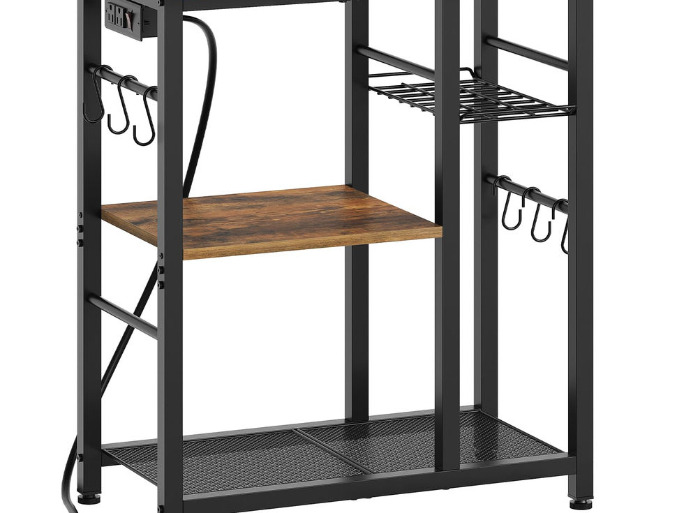 Ample Storage Space: The 4-tier bakers rack features multiple compartments for versatile storage of microwave, toaster, and other kitchen appliances. This microwave stand includes 6 hooks for hanging small tools, and mesh basket for storing fruits and vegetables Two Ways to Use: The movable bakers rack boasts 4 adjustable feet and 4 casters (2 with brakes) for flexible use. The kitchen storage rack moves smoothly when needed and stays securely in place when fixed, transforming from mobile cart to sturdy storage in seconds for different scenes Safe Power Strip: The kitchen storage rack includes 2 standard outlets and a 4.9-foot power cord for convenient kitchen appliance charging. The power strip has a switch to cut off power when not in use, providing extra safety during use Quality Materials: The microwave stand is made of premium particleboard and sturdy metal tubing, ensuring stability and durability. The wooden top can support up to 88 pounds, the mesh shelf up to 33 pounds, and each hook can hold 11 pounds Easy Assembly: The coffee machine rack comes with numbered parts, illustrated instructions, and all necessary tools. Sized 23.6”L x 15.7”W x 31.5”H after assembly, it features a classic color scheme that easily fits into kitchens, dining areas, or coffee nooks