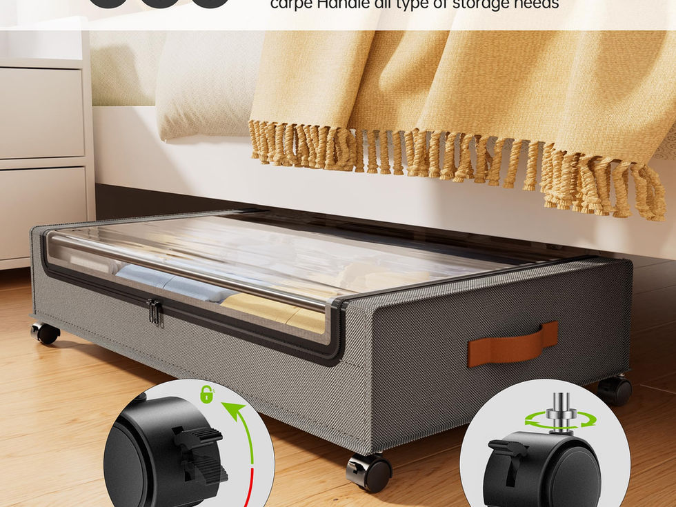 Hold Up to 66lbs: Yecaye under bed storage with wheels is made of high quality 600D oxford fabric and sturdy metal frame, can hold up to 66 lbs, stronger than other fragile metal mesh, spacious capacity perfect for storing clothes, toys, books, shoes and other heavy items also won't compromise stability and durability 360°Rotating Silent Wheels: Say goodbye to constantly carrying heavy storage boxes around your house.This under bed rolling storage comes with 4 x 360°rotating wheels,two of which have locking function.When you need it to remain stationary, just press the locking mechanism gently. No matter how full the cart is, adults and children can easily slide on the floor and carpet Clear Window & Label: Our rolling underbed storage bins are equipped with a Clear window, you can clearly see the stored items, say goodbye to the trouble of misplacing items. Additionly, the included label is great for labeling contents, allowing you to quickly identify and find the item you're looking for without having to open multiple containers or boxes Versatility: Under bed shoe storage dimensions:30.71 x 16.93 x 6.69 inches (with wheels), (applicable under-bed height > 7in), large capacity exceeds your expectation to store more daily items. It can be placed under beds, sofas, tables, and closets to maximize unused space. In addition, this under bed storage drawers can be folded up when not in use, perfect for small families and college dorms that need extra storage space Easy to Install: This rolling storage bin is designed to easy installation and hassle free.Including user-friendly instruction and require minimal effort to set up, which also means you can quickly install and utilize the underbed storage space,saving valuable time and effort,ideal for bed rotting, the blind, and seniors with mobility issues