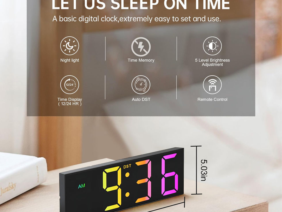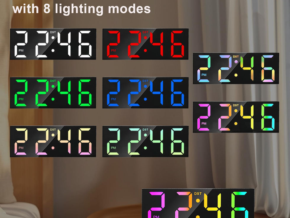 12-inch digital wall clock with high-definition display and 8 color modes for letters, include solid color,gradual change and different multi color modes. A convenient remote control allows you to change colors, so you can have a color or custom color alternation. This digital clock is designed with a bottom night light for your maximun convenient at night. In addition, the daylight saving time feature allows you to easily change the daylight saving time for March and November, and you can use it throughout the year. 12-inch alarm clock with high-definition display screen. Clear and eye-catching giant numbers. There are 2 brightness modes available for you to switch between manually or automatically, and you can set the monitor brightness to levels 0-5. This large digital clock can be hung on the wall or just stand on the desktop, so it fits various occasions, such as living room, bedroom, office, school, warehouse, classroom, farmhouse, gym, kitchen and any indoor occasions. It is not battery powered. It must be used in conjunction with a 5V/2A power adapter (included). There is a memory battery inside that remembers your settings even when disconnected, suitable for all indoor occasions such as bedrooms, living rooms, offices, bathrooms, hotels, etc.