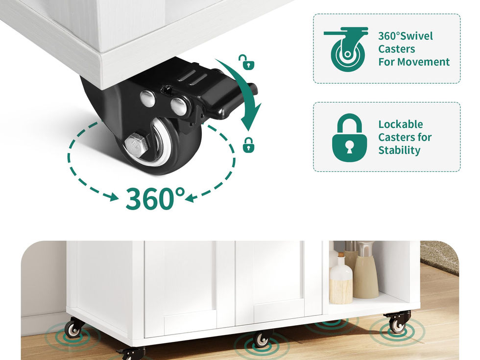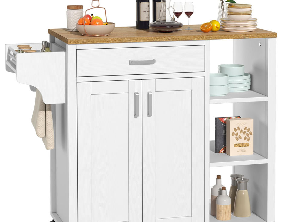 GREAT KITCHEN SIDEKICK: YITAHOME kitchen island cart is a jolly good storage solution to give you more elbow room on the limited kitchen counter for cooking, and also a convenient rolling cart for enjoying delectable food and drinks with family & friends anywhere ONE CART FOR ALL: Features 3 open shelves and 1 spacious wood top to keep pots, plates in apple-pie order and within reach, 1 adjustable shelf behind the cabinet for kitchen wares of different heights, and 1 drawer to keep cutlery neat and clean; the side rack holds your spice jars, and is also used as a push handle; look down, there’s also a towel rack or tissue holder DURABILITY IS VITAL: Thickened wood top with smooth finish is easy to clean and scratch resistant, which can be used as a cutting board or stand to put a microwave oven, roaster, paired with CARB Phrase Ⅱ grade MDF on 4 sturdy legs that can support weight up to 300lbs without shaking MOVING WITH EASE: 360° industrial wheels with brakes allows you to move around to the living room, balcony, garden to enjoy snacks, drinks for cozy afternoon tea or movie night, or lock it next to your kitchen island or dining table for preparing & enjoying fine cuisines. MAKE ASSEMBLY A BREEZE: Comes completely with a step-by-step instruction & required tools so that you’ll enjoy the ease of putting all parts together; any problem will be solved promptly to your satisfaction