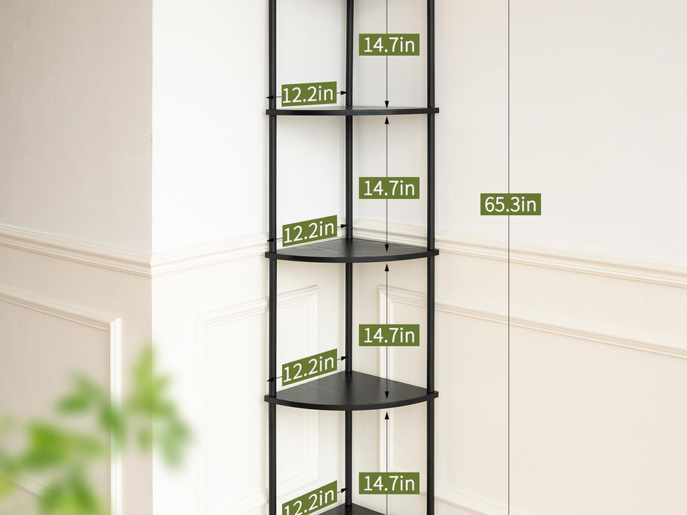 Large Capacity Corner Shelf: Transform any corner with our sleek corner shelf stand! Each tier is 12.2" deep with 14.8" between levels, offering ample space for books, speakers, plants, and more—all within easy reach. Not just a great storage solution, these display shelves transform any corner into a stylish showcase, making it an ideal addition to your home. Sturdy and Durable: Experience the great blend of durability and stability with our corner bookshelf. The small corner shelf is crafted from premium wood and reinforced with a thick steel frame. Moreover, its triangular structure, extra support leg, an upgraded anti-tip device, and adjustable foot pads for superior steadiness. Each tier holds up to 33 lbs, easily supporting your stuff. Versatile Display Shelf: The versatile corner stand goes beyond a simple corner bookcase. It serves as a corner plant stand, decorative corner shelving, storage corner shelf unit, kitchen corner shelf, corner display shelf, etc. Perfect for the living room, bedroom, study, or kitchen, it enhances the functionality and style of any space. Available in multiple colors to match your decor well. Master of Space Utilization: No corner space is wasted with this tall bookshelf! Designed to fit snugly against the wall at a 90° angle, this compact yet spacious ladder shelf maximizes vertical storage. Plus, its unique fan-shaped design increases storage area and features curved shelves with smooth rounded edges to minimize collisions and scratches. Easy Assembly & Warranty: Piece of cake to assemble the corner book shelf—Just twist the pipes by hand, no tools needed! The ladder bookshelf includes a detailed manual, labeled parts, and a QR code for an assembly video. You can also check the assembly video on the product page. Enjoy peace of mind with our 1-Year Warranty and quick 12-hour customer response service.